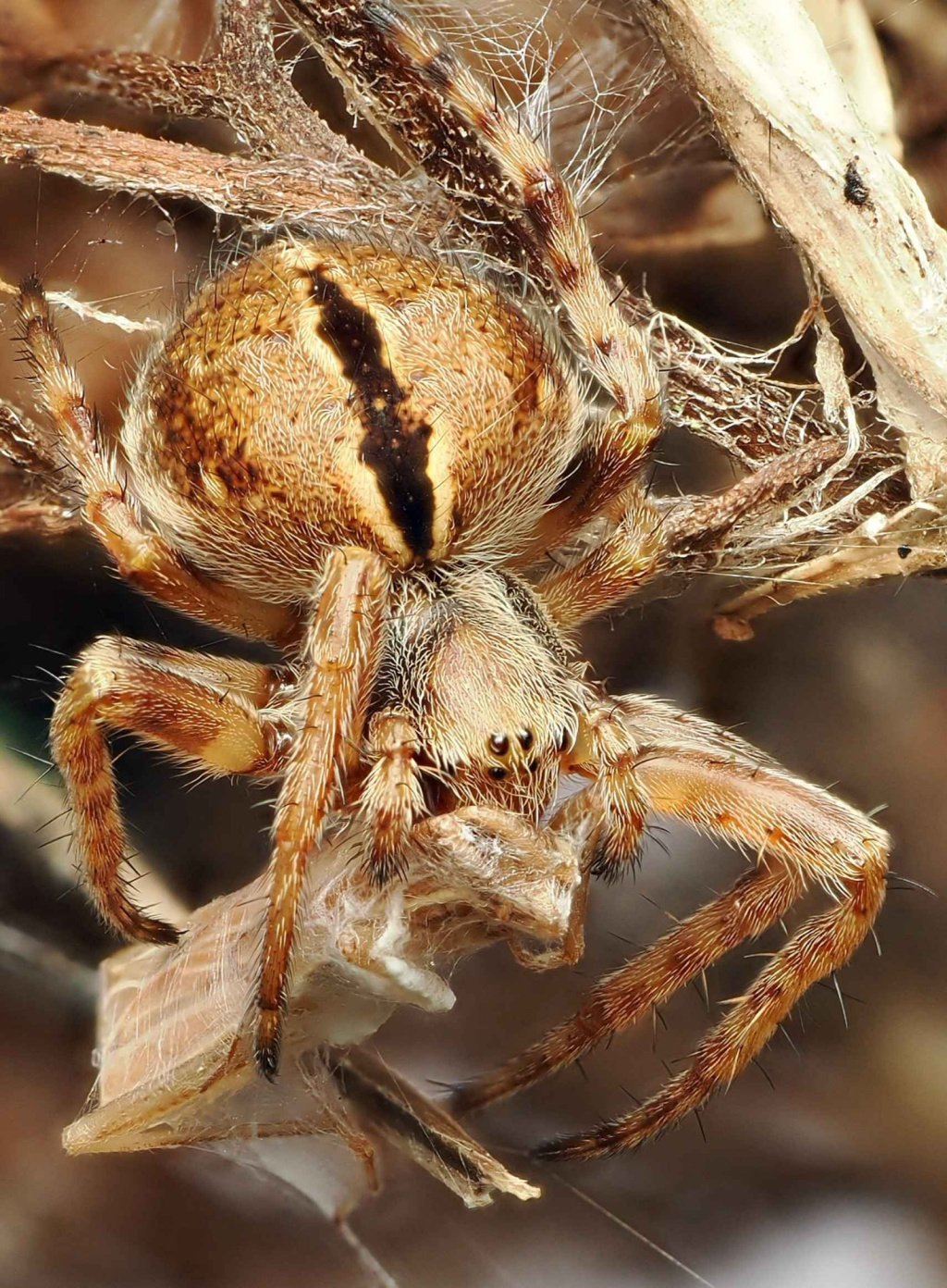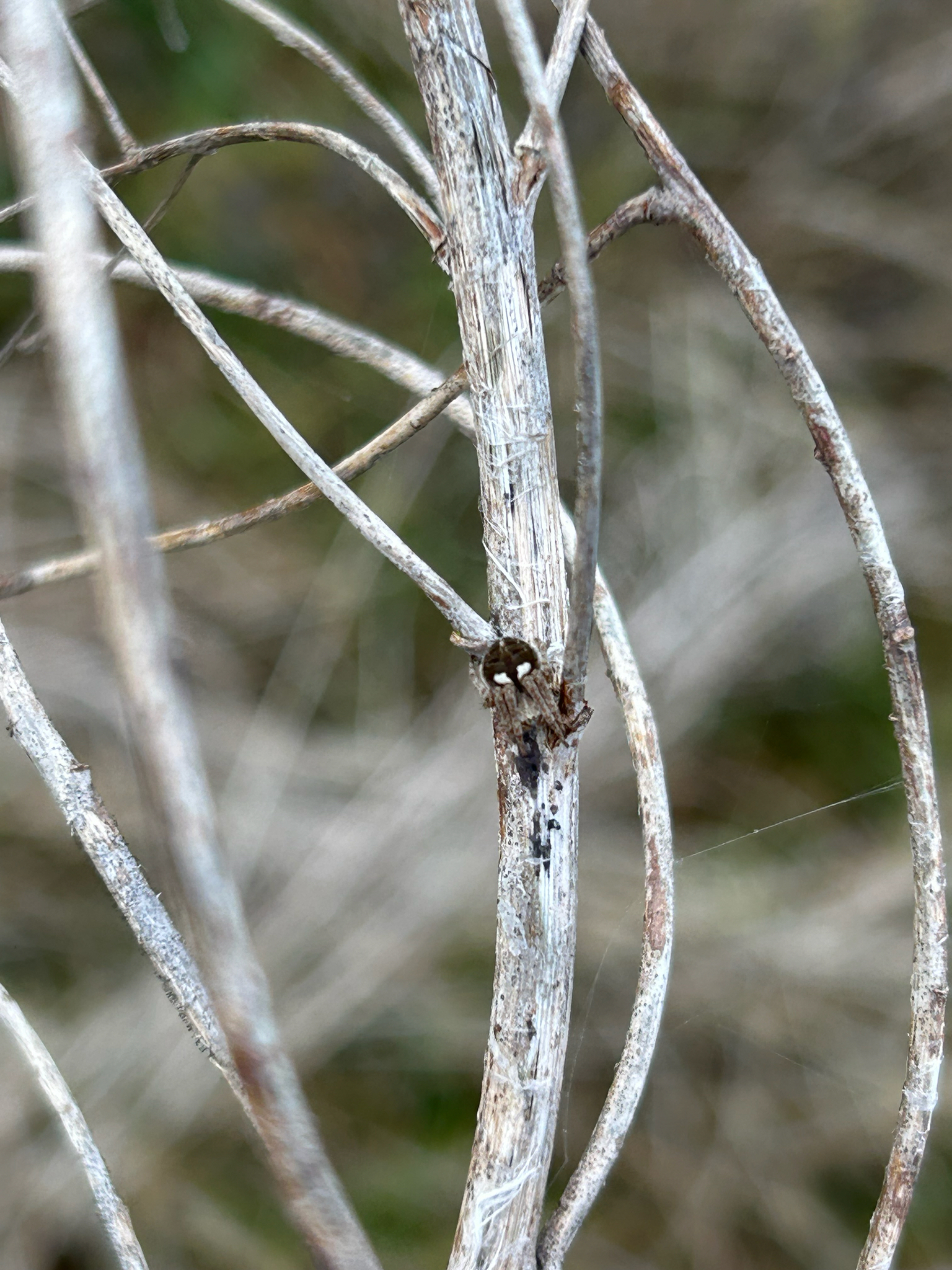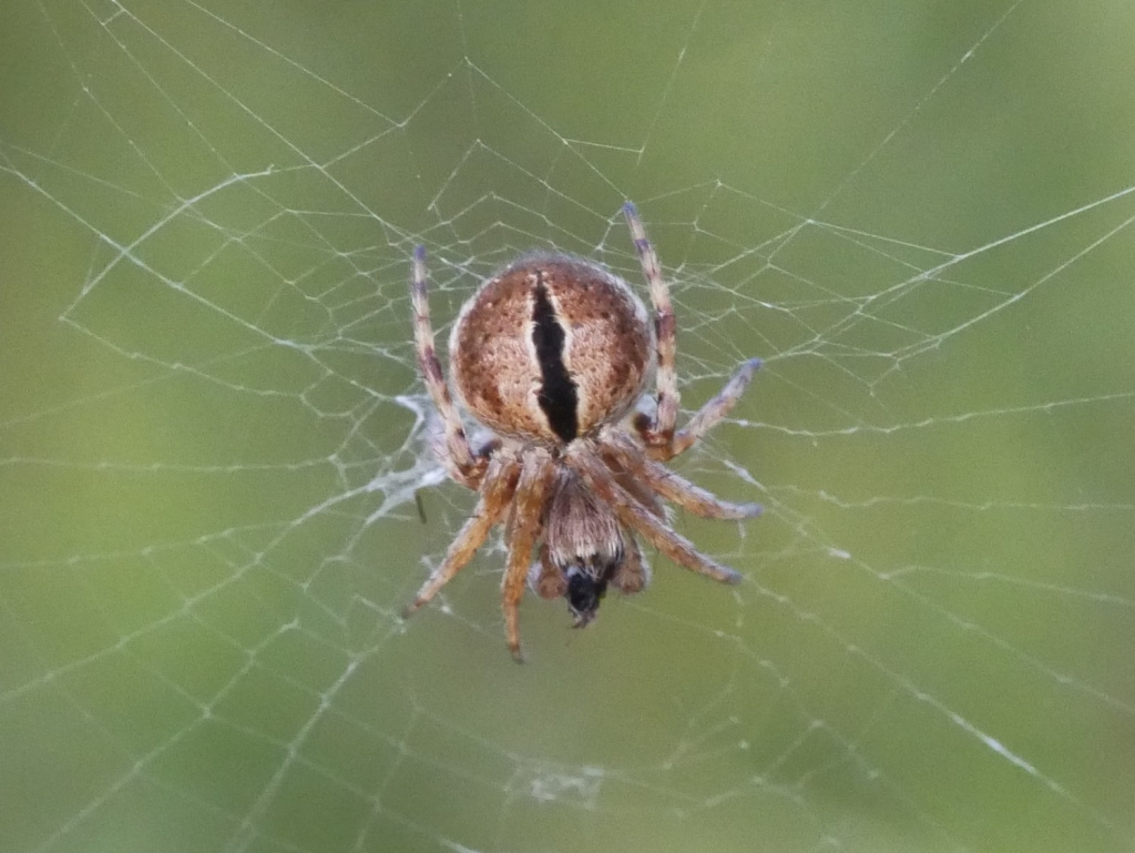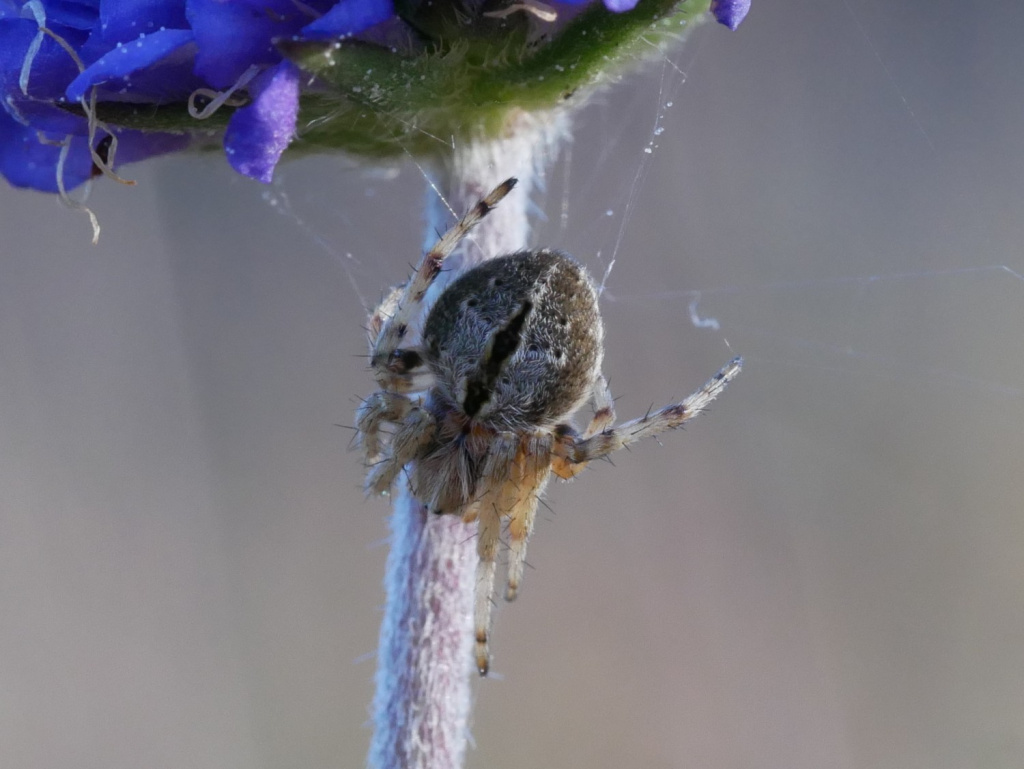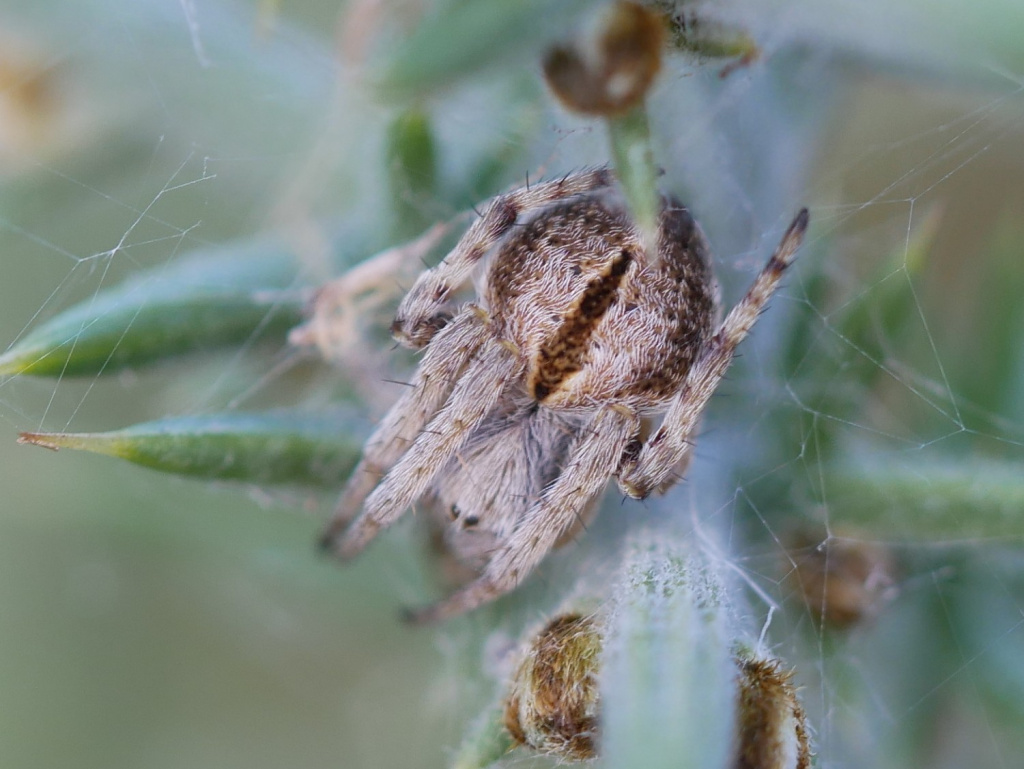 The species is found in heather and gorse, usually below one metre above the ground, and rough grassland where the spider often makes its web between dead herbaceous stems with a retreat in a dead flower-head. In the north of England the spider is most common on sand dunes, often on creeping willow (J. Newton, pers. comm.). The hub of the medium sized orb web is often covered with fine silk. The spider's abdominal markings show considerable variability (see Jones (1983)). After over-wintering as a sub-adult, adults can be found from late spring to mid-summer.Status