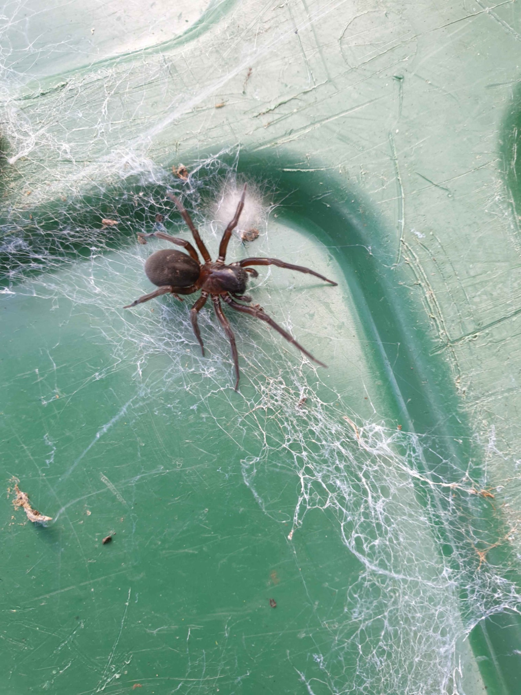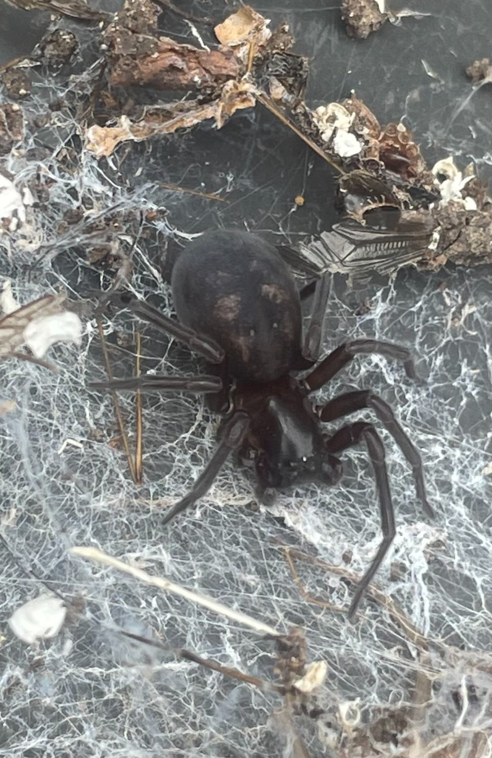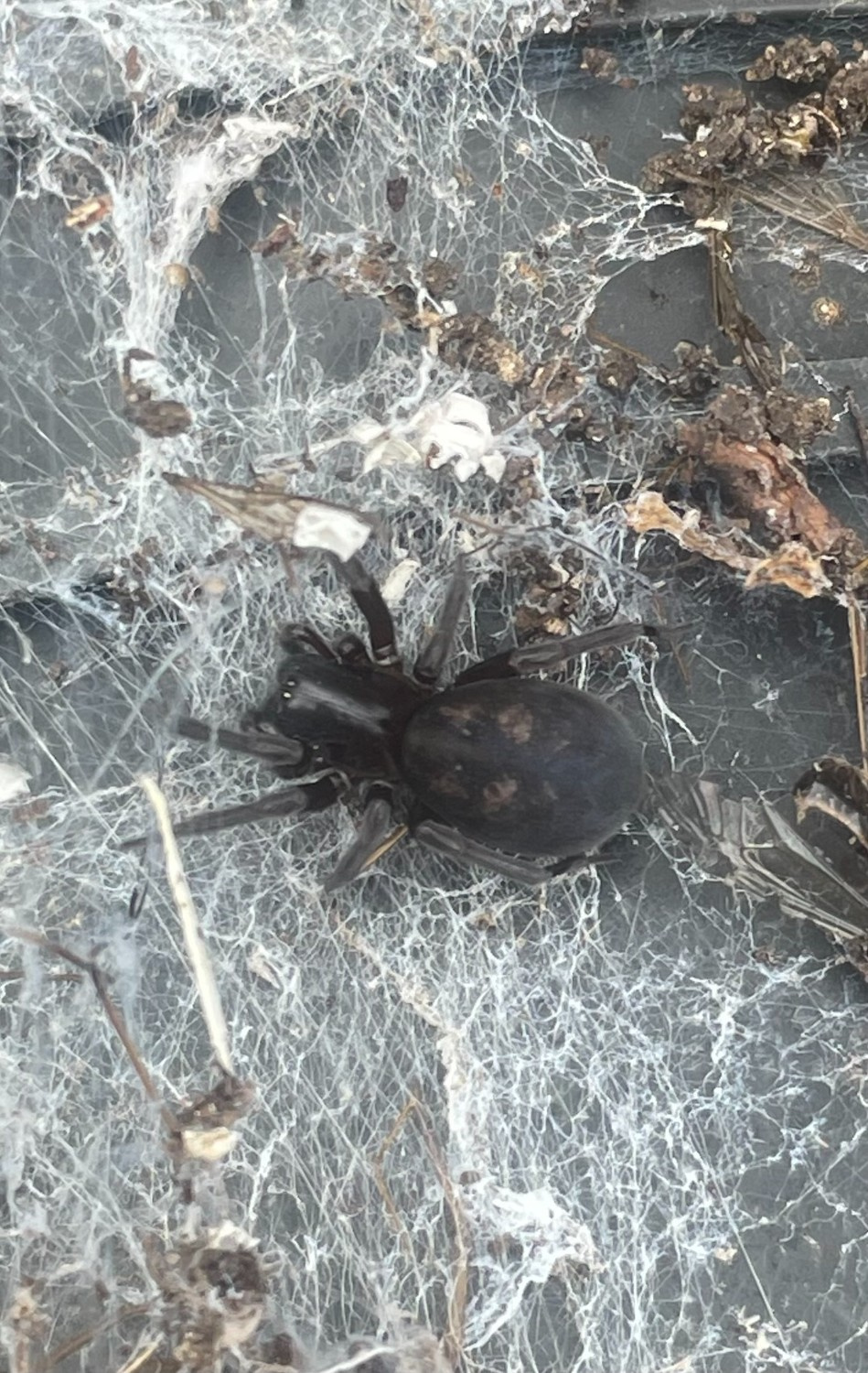 The species is found in gardens, cellars and outhouses under rubble or other debris but is also recorded in more natural habitats under logs in woodland or hedgerows and under stones. According to Bristowe (1958) the species is more likely than the other two Amaurobius species to be found in shady and damper situations in walls or at the entrances to caves or tunnels. It is probably under-recorded despite its large size and impressive appearance. Adults occur throughout the year but mainly in the spring and early summer.Status