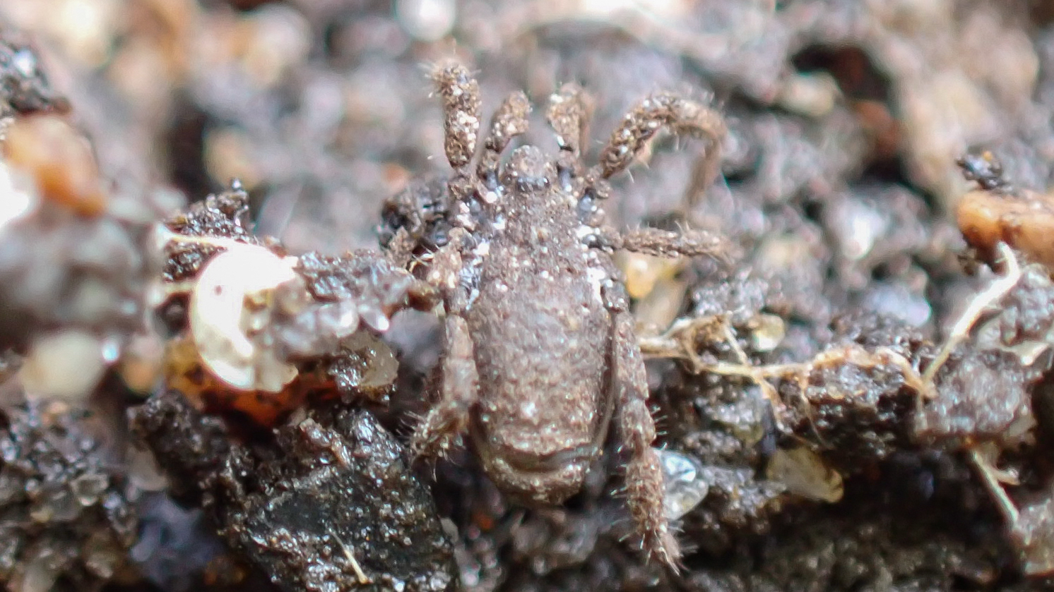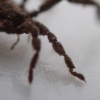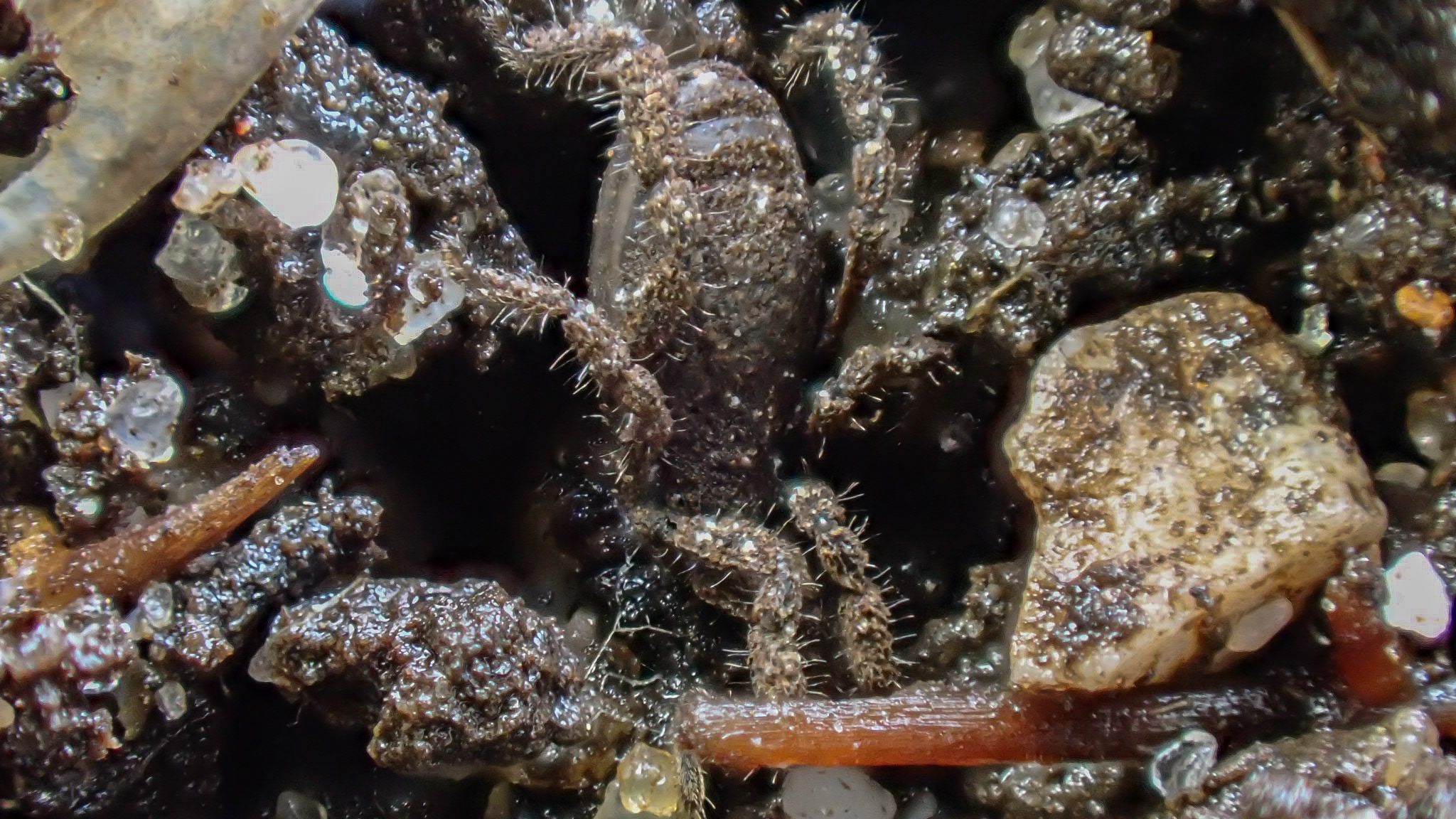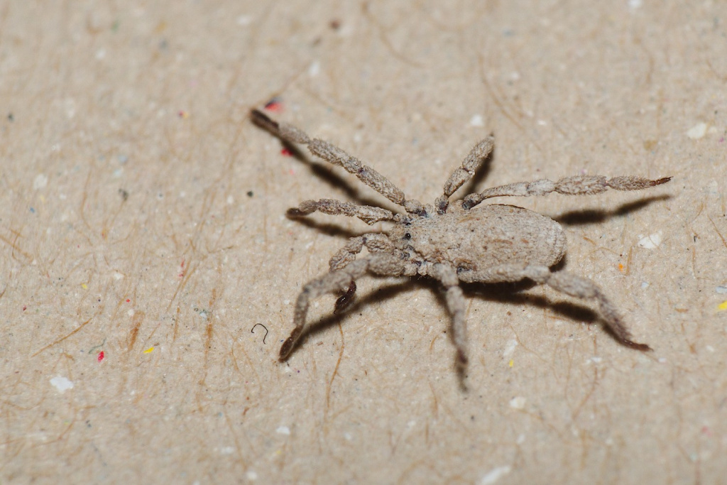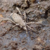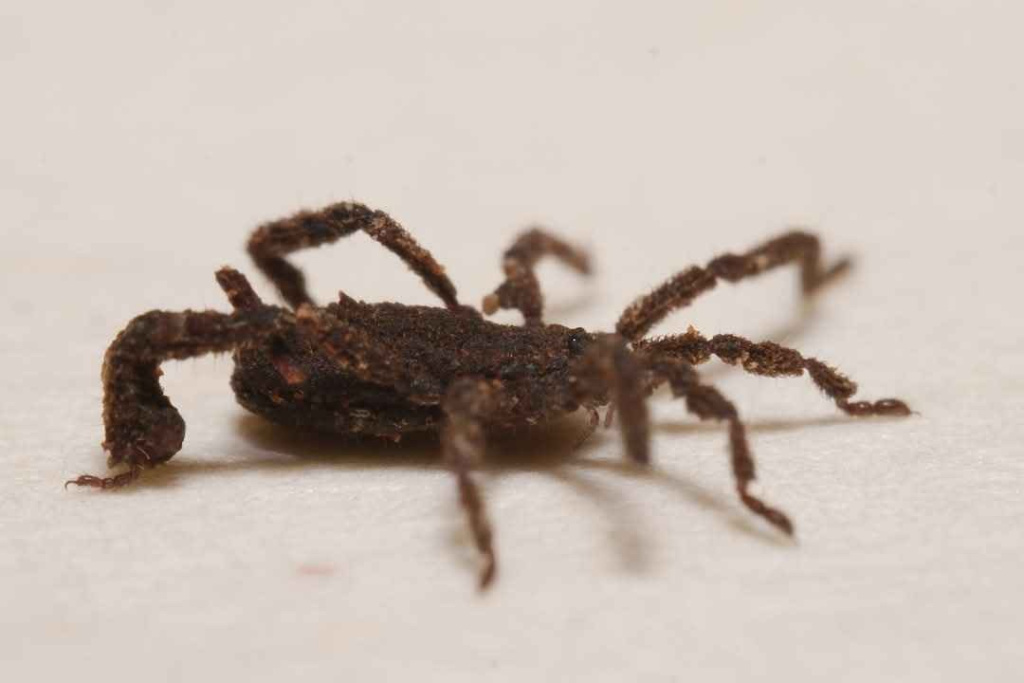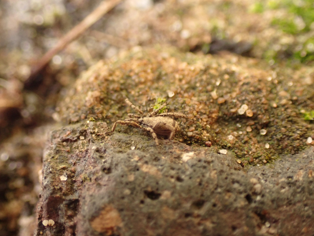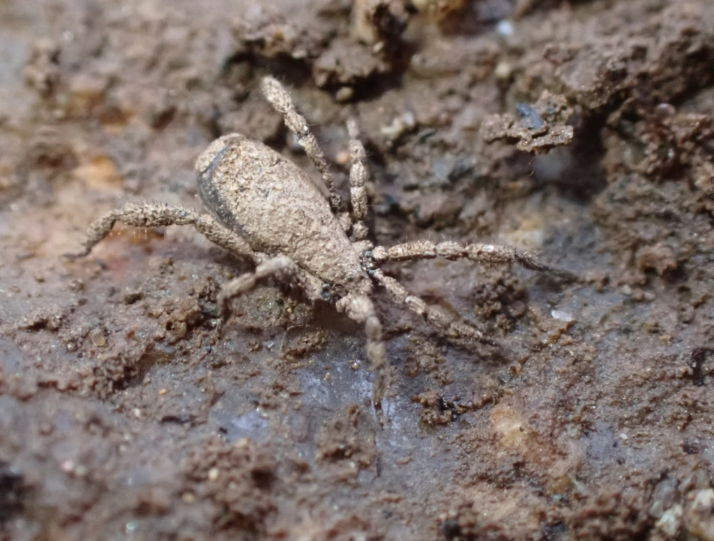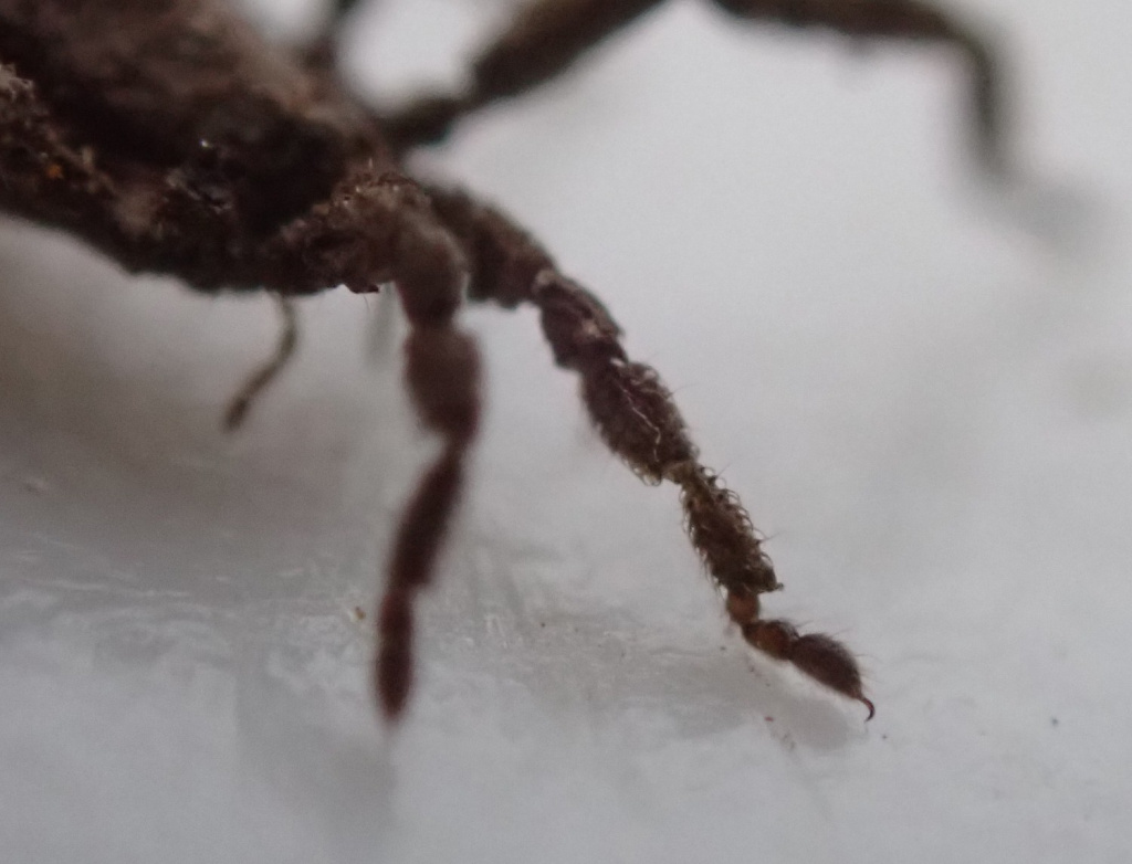 Like Trogulus tricarinatus, this flattened, short-legged species is restricted to the ground layer in calcareous soils and is a specialist (but not obligate) snail-feeder. It is most easily found by sieving soil and pitfall trapping but has been collected from under stones and logs, and in leaf-litter, grass and moss, preferring rough grassland and semi-open woodland. Both Trogulus and Anelasmocephalus secrete glue by which soil particles adhere to their bodies - presumably providing them with visual camouflage against predators and possibly also allowing them to blend chemically and physically with their soil environment. Anelasmocephalus hooded mouth-parts may reduce the problems of dealing with snail mucus and soil. Its habit of playing dead (catalepsy) and its colour, blending with soil particles, makes it difficult to spot for birds and other visual predators (and humans). Juveniles are generally free of soil and a lovely purple colour. Adults are present throughout the year and may live for up to three years. Eggs are laid in empty snail shells and protected with a web-like secretion from the ovipositor (Pabst 1953). Juveniles are found mostly between May to October. HRS records show this species occurring at altitudes over 200m in the Malham area of Yorkshire.