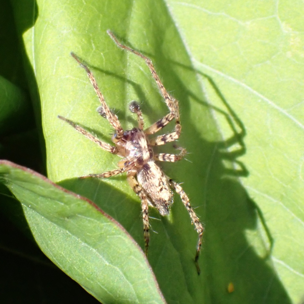 This species is found in woodland and bushy areas. It is easily recognisable by the distinctive arrow-like markings on the abdomen quite unlike any other British species. The spiders hunt and mate on the leaves of trees and bushes. During courtship the male is known to emit a high pitched buzzing sound by vibrating its abdomen on a leaf. This sound may be inaudible to older people. Adults of both sexes are mostly found in early to mid-summer with females sometimes surviving through to the autumn. Immatures can be found in ground vegetation, leaf litter and under bark in the autumn and winter.Status