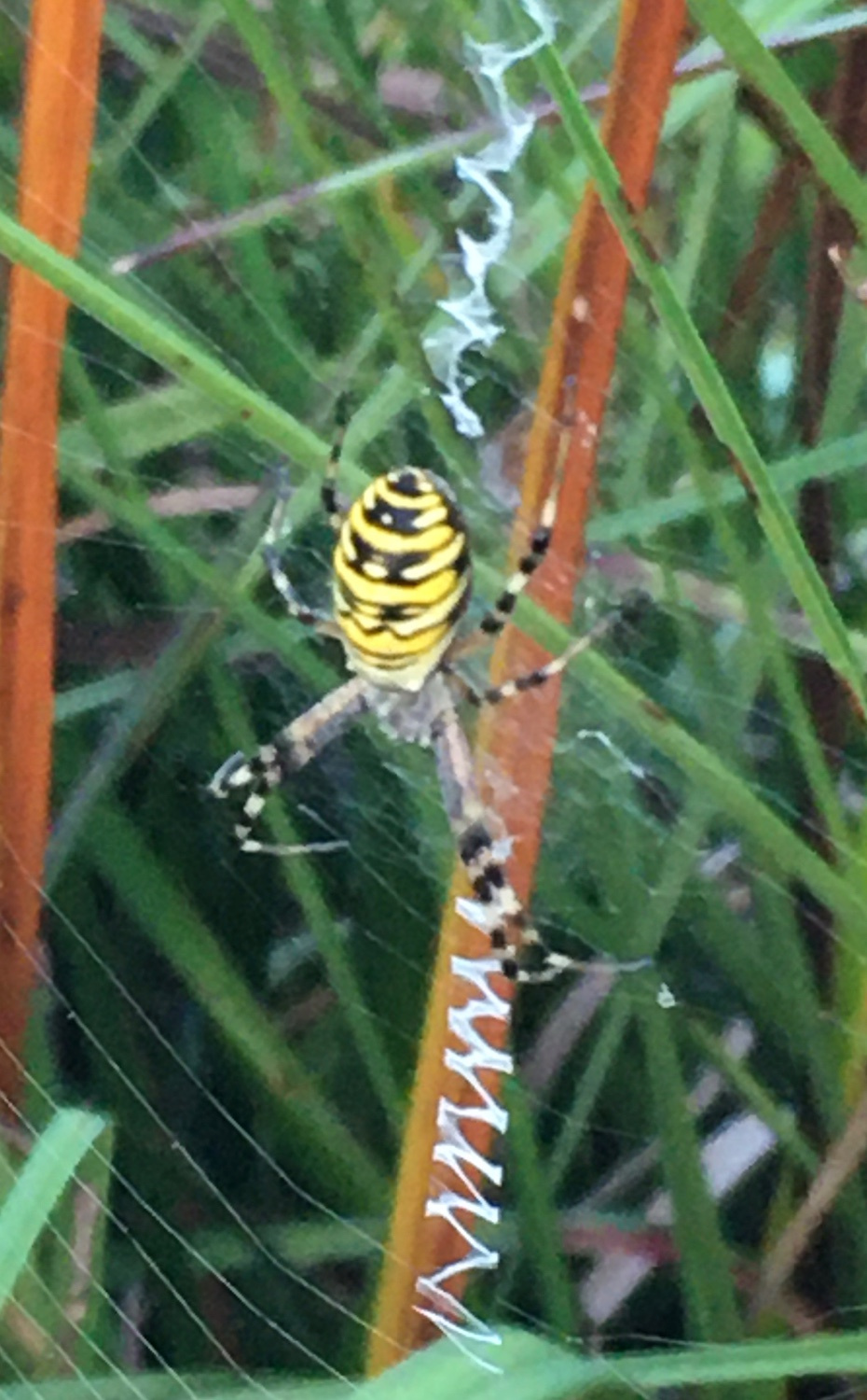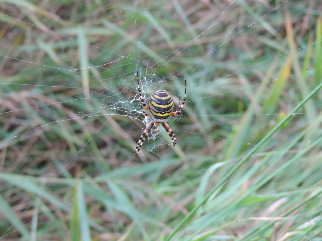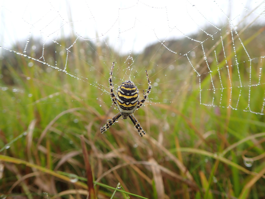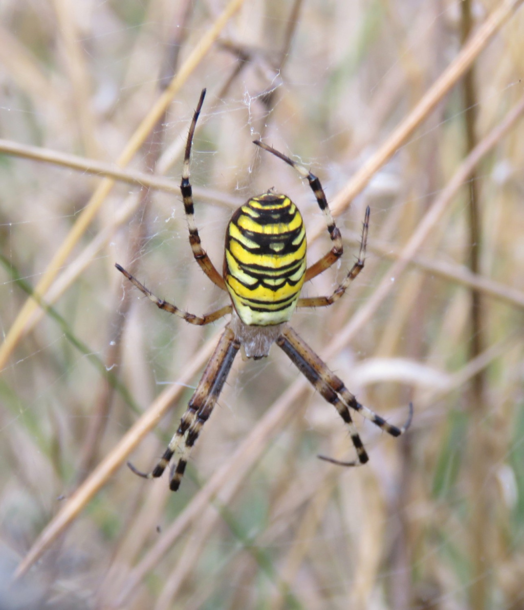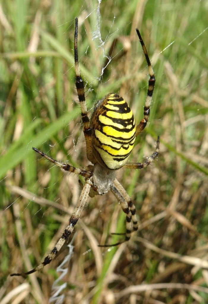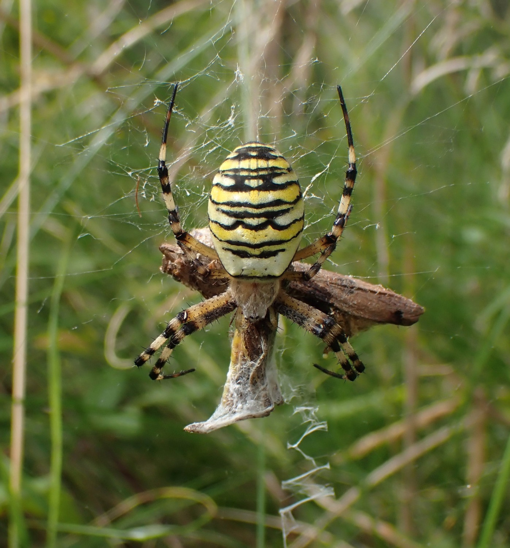 The spider has a very striking appearance with black and yellow horizontal bands on its abdomen. It spins a large orb web with a stabilimentum and favours areas of coastal chalk grassland, open rough grassland, wasteland and roadside verges. P. Harvey (pers. comm.) has seen depauperate juvenile spiders in a wheat field, but these individuals were unlikely to survive to mate or produce egg-sacs. In northern France the author has recorded Argiope bruennichi in large numbers in unmanaged damp grassland. The large orb webs are slung low down in the vegetation and the adult spider is easily hidden by the surrounding herbage. Grasshoppers form the main food item. The large urn shaped egg cocoon is positioned in the higher levels of vegetation and the eggs over-winter, hatching out in the following spring. Both sexes mature in the late summer, the females perhaps living on until October but the much smaller males living for only a short time.Status