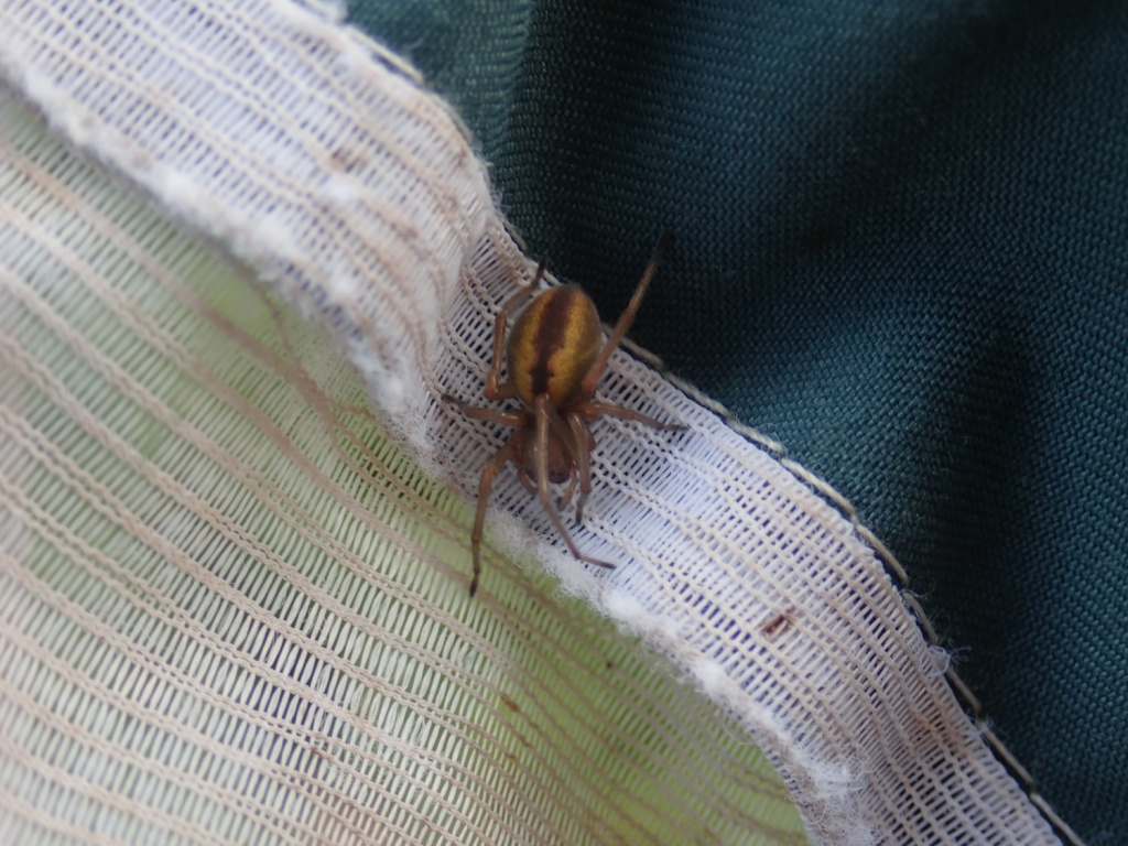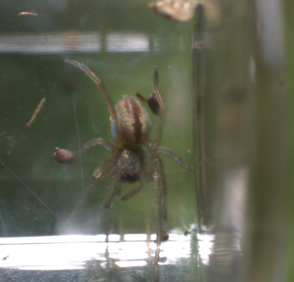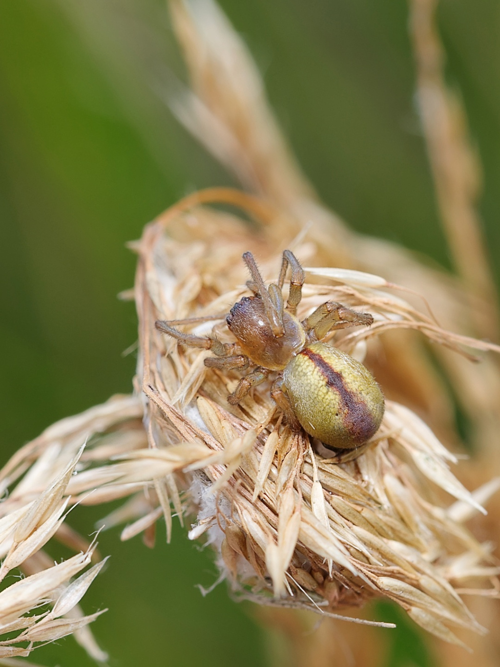 The spider occurs on low plants in rough vegetation and heather. It is most easily found in early summer by looking for the retreat constructed from two or three leaves, or grass heads, stitched together to make a retreat which will hold the female and egg-sac. Later in the year, immature specimens, which already show the reddish median stripe on the abdomen, can be found in small silk cells on plant stems such as dried docks. Adult males are found mainly in late spring and early summer, females from late spring to the autumn.Status