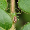 This species is strongly associated with woodland, perhaps with a preference for evergreens and conifers, and is found on the leaves of bushes and trees such as oak, box, yew and conifers, and is therefore usually collected by beating. It can also be found in leaf litter, and occasionally in the field layer of undisturbed scrubby grassland (Crocker & Daws 1996), and on fence posts in 'ballooning' weather. Females can be found guarding the eggs, which are covered with a thick layer of silk in a partially bent leaf. The characteristic colouring allows adults and juveniles to be identified in the field. Adults of both sexes are found mainly in May and June, females persisting occasionally into the autumn.Status
