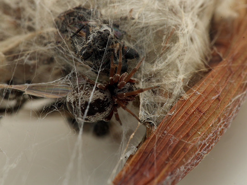 The species is found on low, especially dry or dead vegetation (Jones 1983), in rough grassland or herbage growing at the edges of fields, hedges and woodland rides. It spins its web in the tops of plants which supply rigidity and suitable structural spaces. The old heads of various umbellifers, docks, thistles and plants like Hypericum are favoured situations. On heathland the spider is very common on heather. The spider is not deterred by the prey's size, which is always bitten in the leg until dead. Adults occur from late spring to mid-summer. In June the male seems to stay for a month or more in the female's web where they both live in a rough chamber with several openings (Bristowe 1958).Status