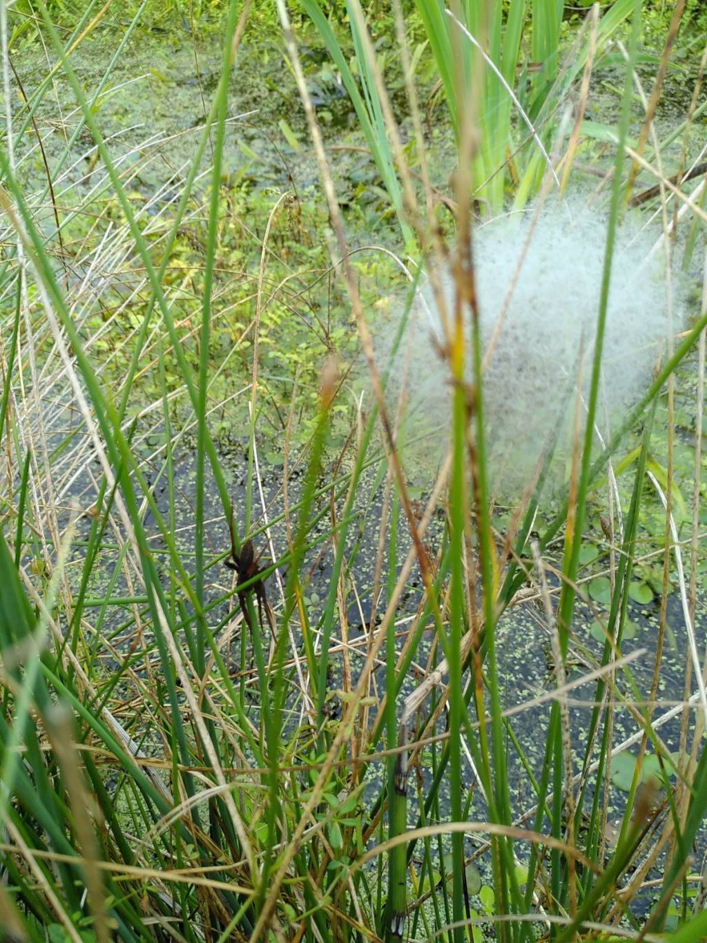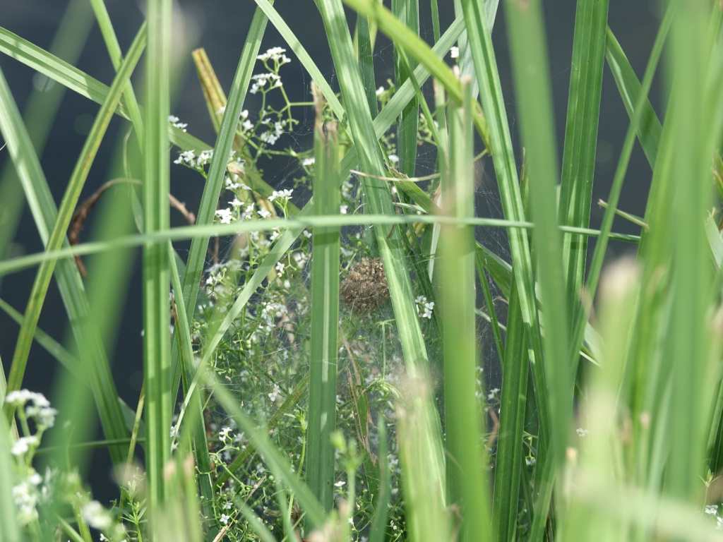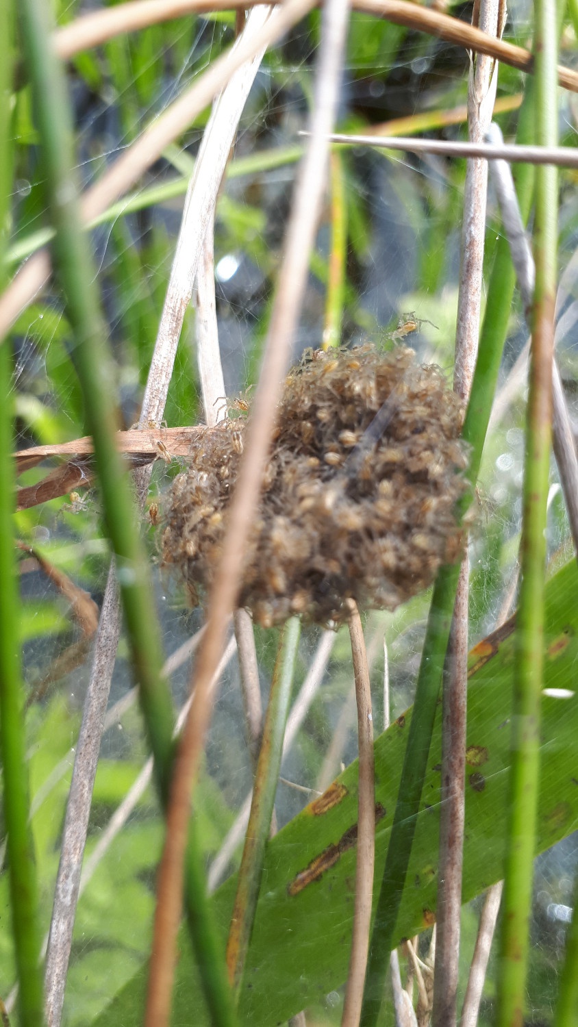 At South Lopham Fen this species is found among saw-sedge Cladium mariscus, particularly around small pools formed in old peat cuttings. Pools around which fine-leaved grasses such as Molinia have become established are not favoured. It is probable that young spiders hatching in early summer mature the following year while those hatching in late summer spend two winters as juveniles. At South Lopham, adults are found from May to August. In the Pevensey Levels spiders have been found at the water's edge of a drainage ditch under overhanging vegetation. The Welsh site is also a lowland waterbody fed by neutral to alkaline, base-rich water. Tussock Sedge Carex paniculata provides the main structure at this site for nursery webs.Status