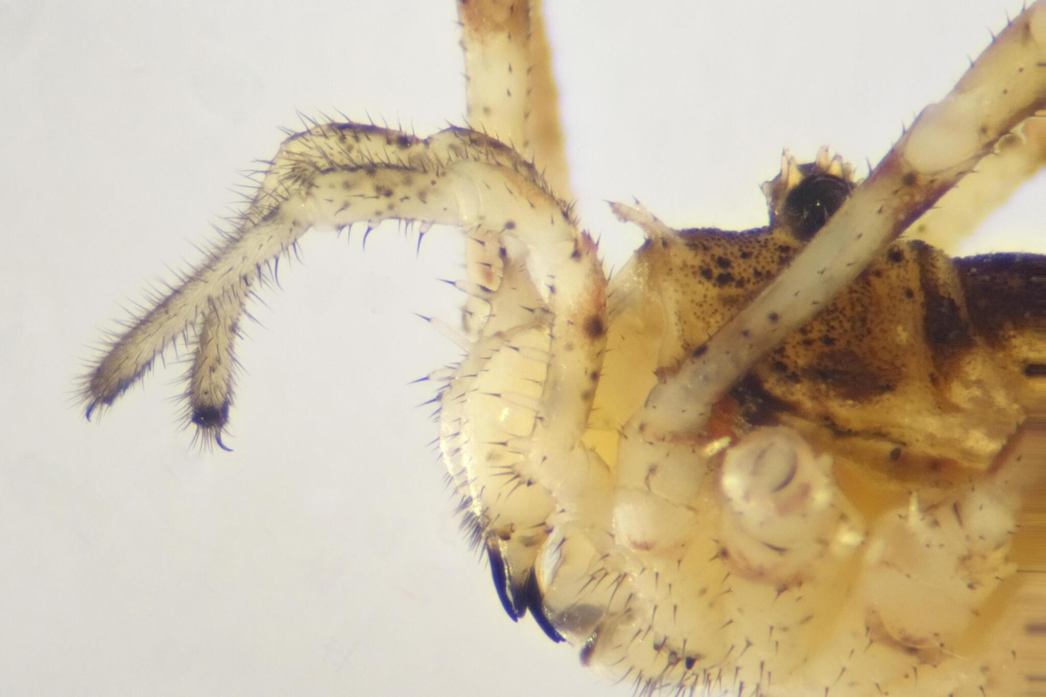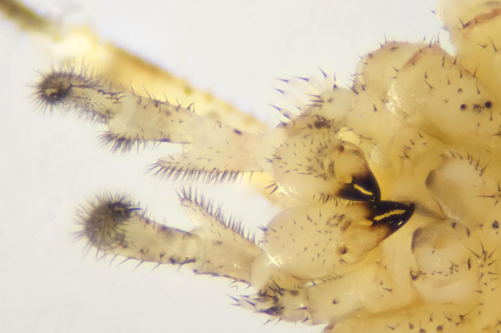 The most notable feature of this species is the structure of the palps; with their relatively huge downward pointing tubercles and inward facing outgrowths, together with a forward-pointing trident, they form a formidable cage around the mouthparts. This is perhaps similar in function to the mandibles of the ground-beetle Leistus. This structure undoubtedly assists in prey capture and indeed their recorded invertebrate food includes hard-to-catch springtails as well as homopteran bugs, barkflies, diptera, myriapods, spiders, earthworms and gastropods. It has also been reported feeding on mushroom juices.
