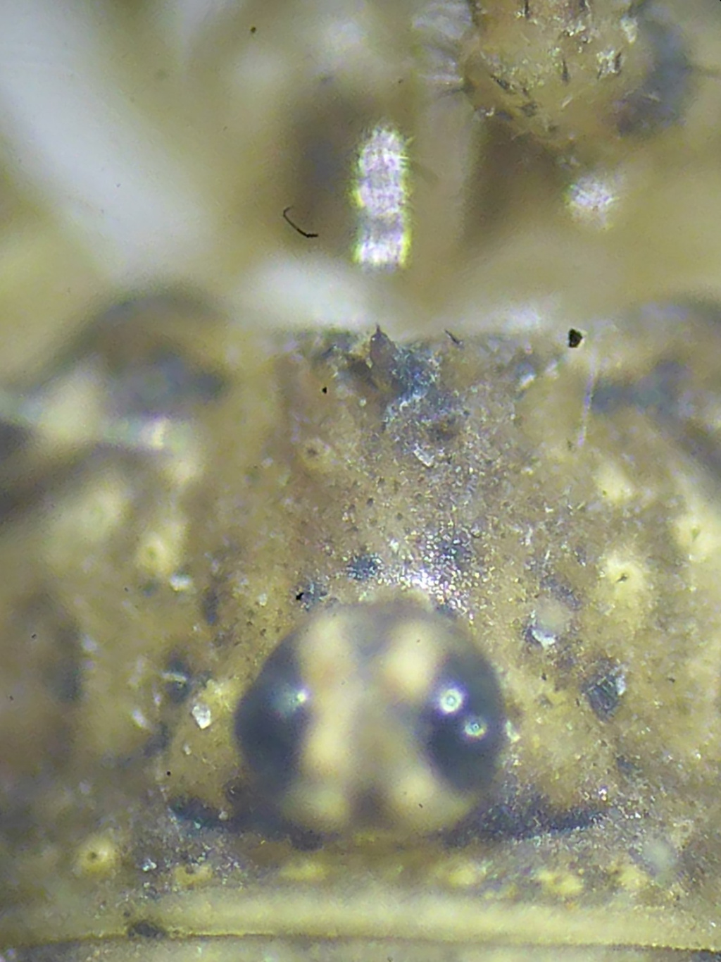 Oligolophus tridens is a plain brown harvestman characterised by a rectangular saddle and a row of distinctly pale tubercles around the eyes. It does not have prominent spines on the underside of the palpal femurs as seen in the similar Lacinius ephippiatus.
