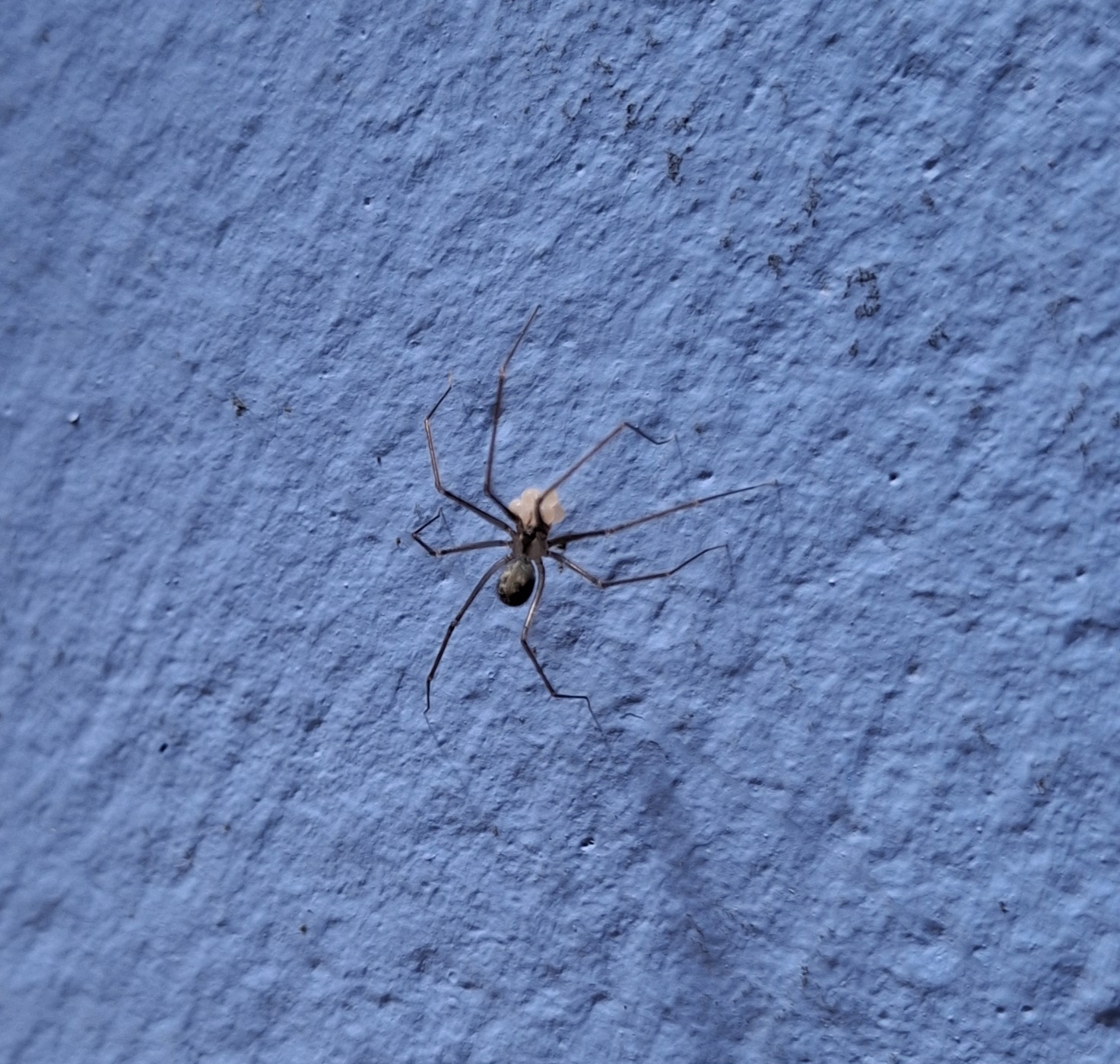 Most early records were from dry wine cellars, but it is now recorded in other indoor situations (Merrett 1979), usually found close to floor level. The female hangs upside down in a tangled sheet web and gyrates very rapidly if disturbed. She carries the bundle of eggs in her chelicerae, loosely surrounded by silk threads, until they hatch. Adults may be found at all seasons and in Europe it has been observed that males may live for two years and females for three to four years (Bristowe 1958).Status