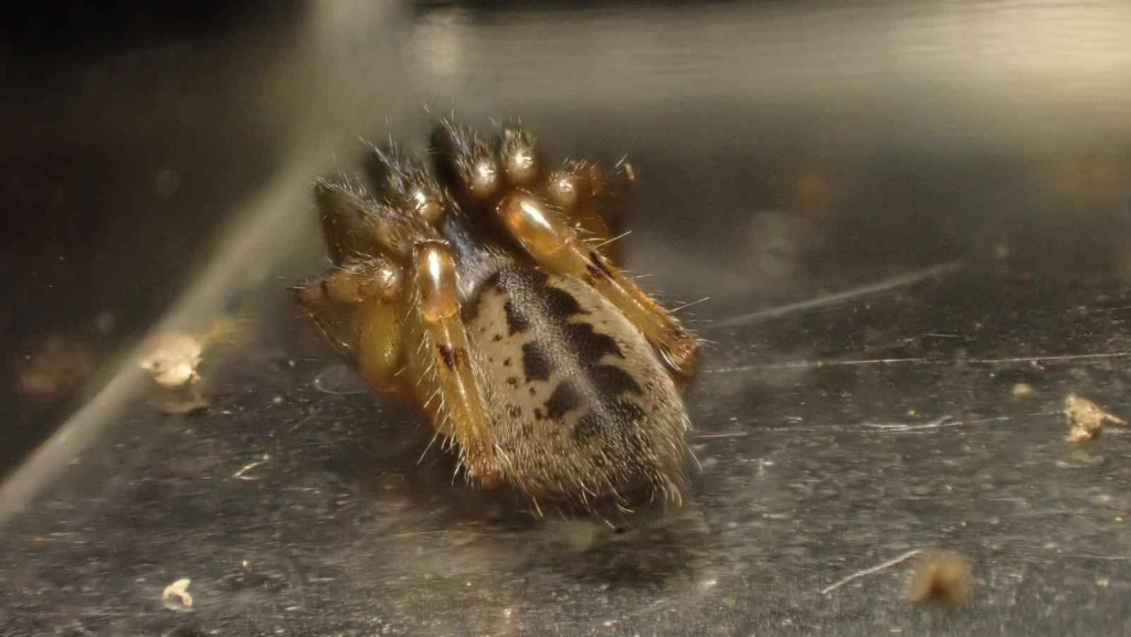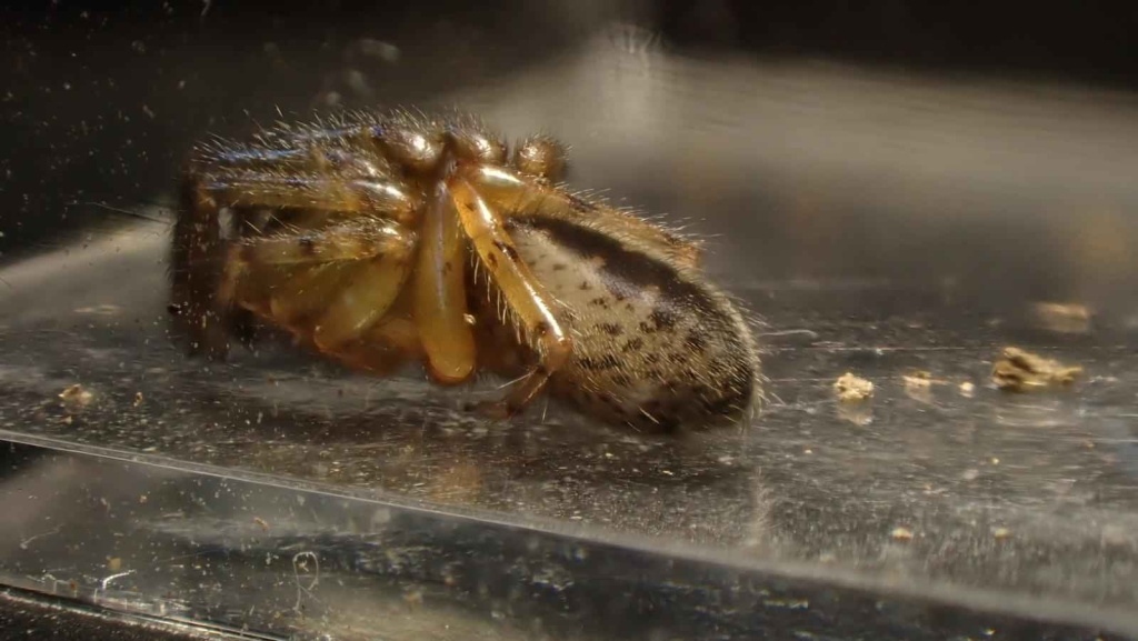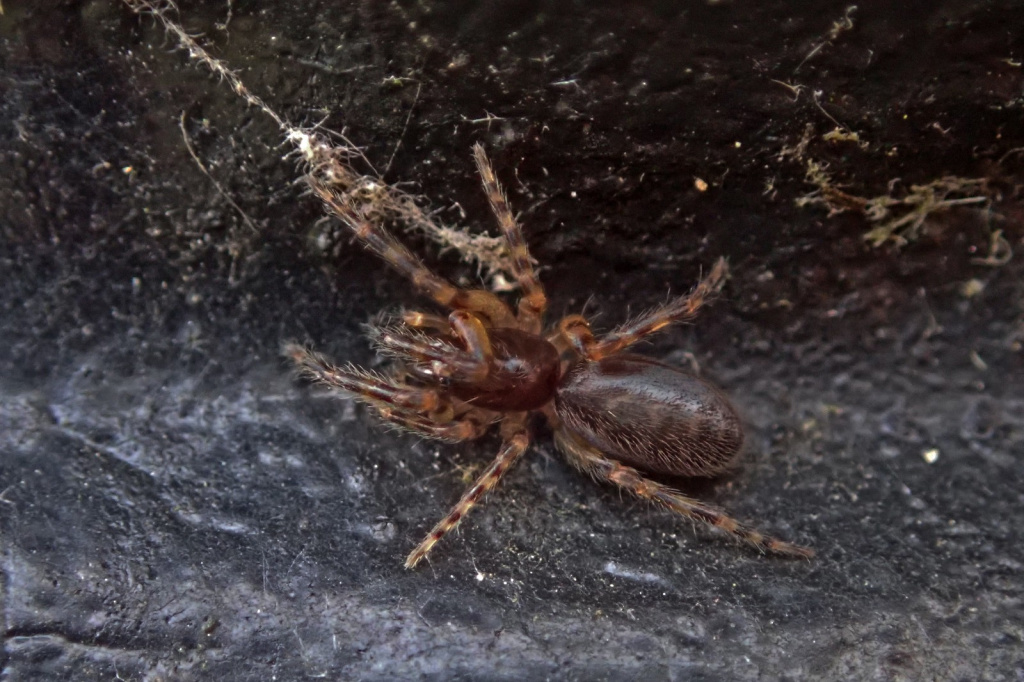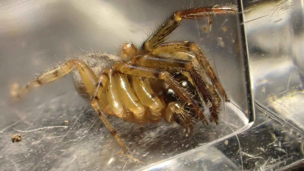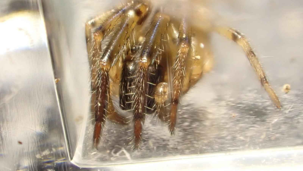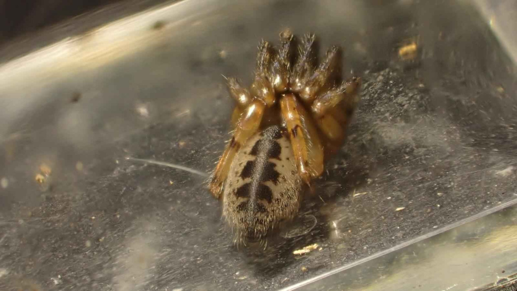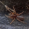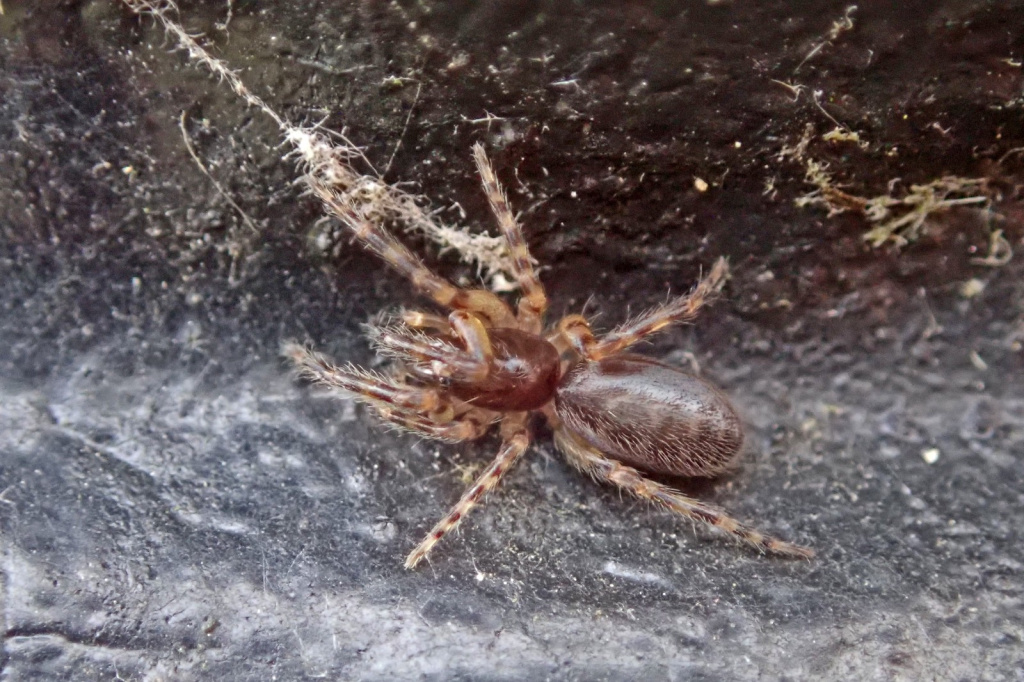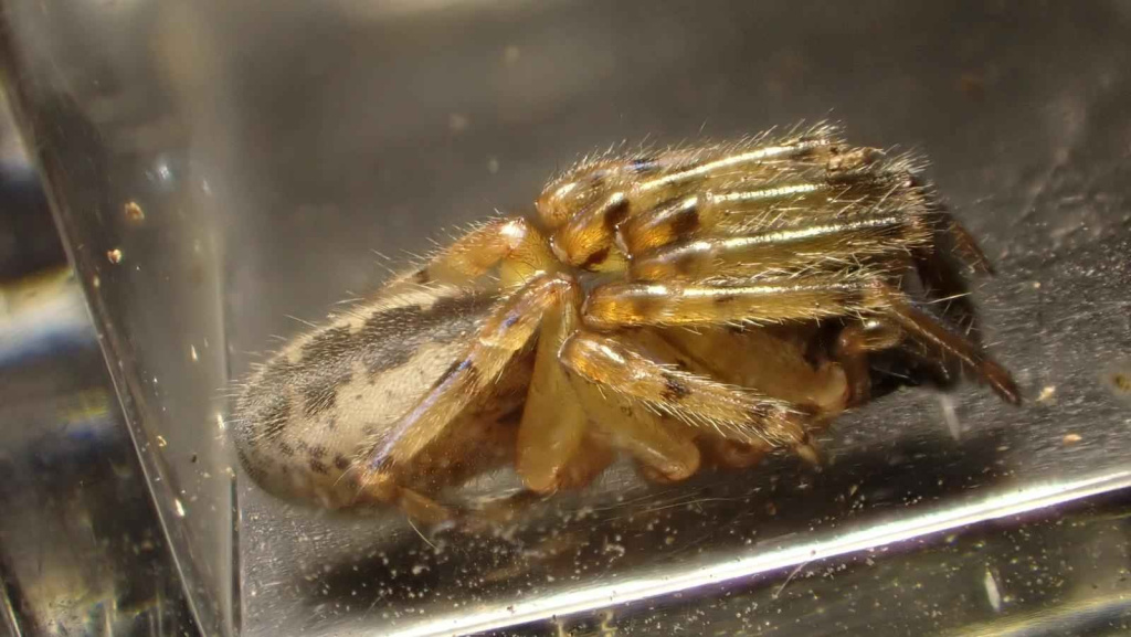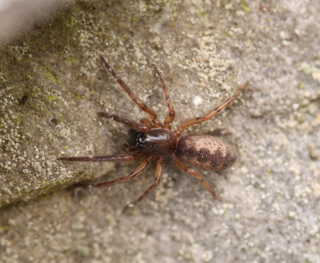 This attractively marked spider lives in a tube constructed in a hole in a wall, under bark and stones or in rubble and scree, from sea-level to high altitudes (over 500 m in Shropshire and West Lancashire). Strong threads which act as trip wires radiate out from the hidden tube. The spider waits in the entrance of the retreat for unwary prey to touch the threads before dashing out to seize and drag the victim back into the retreat for consumption. Sometimes the spider can be enticed out with a tuning fork or a grass stem. Adults occur throughout the year, but both sexes seem to peak in spring and early summer. The eggs are laid within the female's retreat and the young stay there after hatching, sometimes eating their mother before dispersing (Roberts 1995).Status